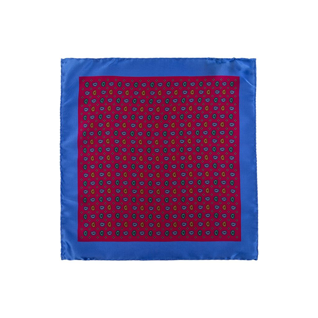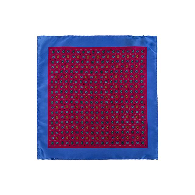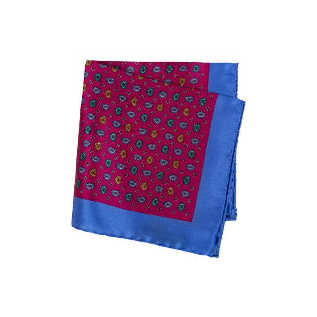 Pañuelo de bolsillo con diseño cachemire en fondo rosa intenso y borde azul
