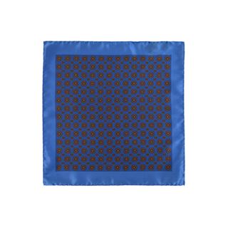Articolo: Fazzoletto da taschino in seta con fiori su sfondo blu navy e bordo marrone.